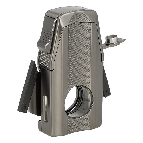 Integrovaný dvojbritový orezávač s ostrými čepeľami sa postará o rýchly a čistý rez, zatiaľ čo výklopný vyštipávač (Ø 8,5 mm) poslúži ako precízna alternatíva. Na zadnej strane nájdete textúrovanú “prohlubeň”, ktorá funguje ako stojan – ideálne miesto na odloženie cigary počas fajčenia.