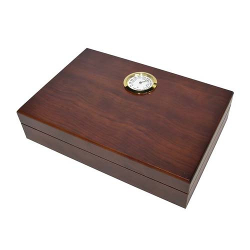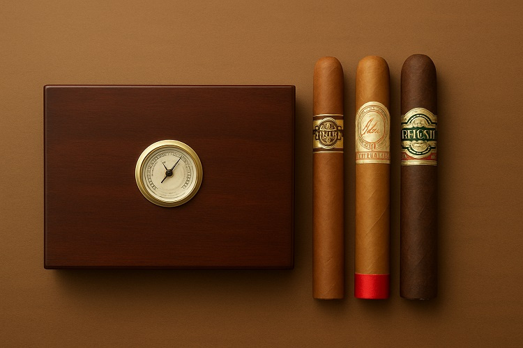 Výber dopĺňa elegantný menší humidor v tmavohnedom prevedení, ktorý zabezpečí ideálne podmienky na uchovanie vašich cigár a zároveň pôsobí ako štýlový doplnok.