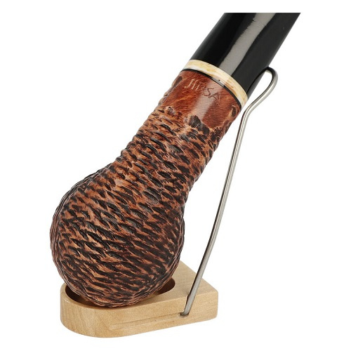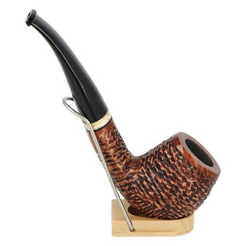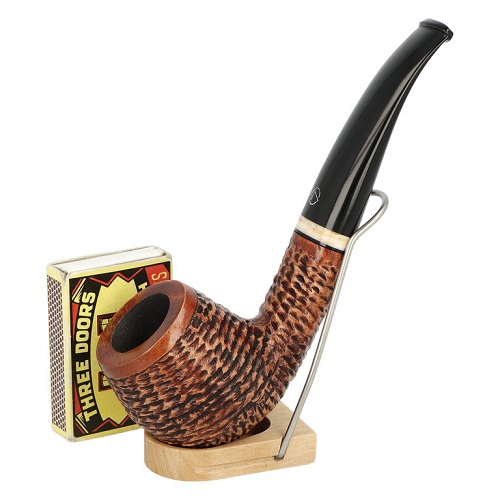 Fajka má hnedú rustikálnu povrchovú úpravu so zachovanou kresbou dreva, ktorá jej dodáva prirodzený, remeselný a nadčasový vzhľad. Zahnutý tvar poskytuje pohodlné držanie a príjemný fajčiarsky zážitok. Hlavička je pololesklá a dopĺňa ju elegantný čierny akrylátový náustok. Celkový vzhľad fajky zvýrazňujú ozdobné krúžky, ktoré jej dodávajú jemný prémiový detail.