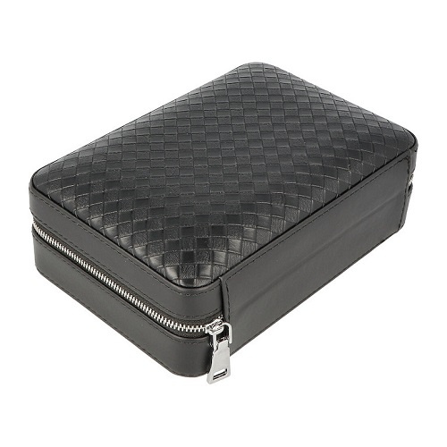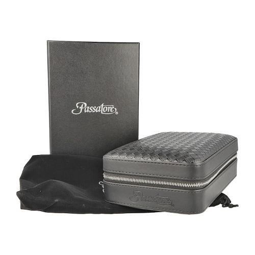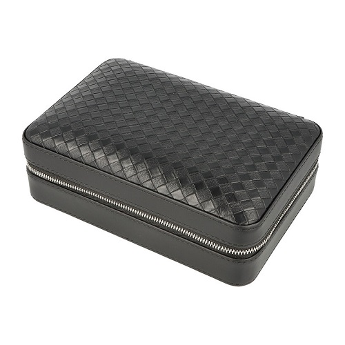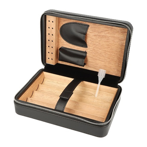 Cestovný humidor s náročne spracovaným vonkajším koženkovým prepleteným lemovaním v čiernej farbe. Vnútorný priestor je vybavený vložkou, ktoré je pripravená poňať tri cigary a vďaka pripraveným vreckám odložiť zapaľovač a orezávač. Praktický humidor, v ktorom je všetko po ruke. Zvlhčovanie je zabezpečné prostredníctvom vstavaného zvlhčovača. Cédrové drevo je prírodný materiál, ktorý je najvhodnejším materiálom pre výrobu humidorov. Jeho pórovitosť nasaje vlhkosť potrebnú pre zvlhčenie a uchovanie cigár v skvelej kondícii. Na doplnenie zvlhčovania odporúčame vkladať do malého priestoru humidora vrecko Boveda, ktoré odovzdáva a zároveň prijíma vlhkosť podľa potreby humidora.