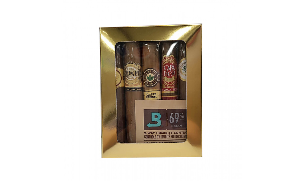 Balenie v elegantnej zlatej krabičke s priehľadným vekom je doplnené drevenou plsťou, ktorá dodáva rustikálny šarm. Pre udržanie sviežosti cigár je k setu pridané zvlhčovacie vrecko Boveda 8 g, ktoré zabezpečí ideálnu vlhkosť až do posledného potiahnutia.